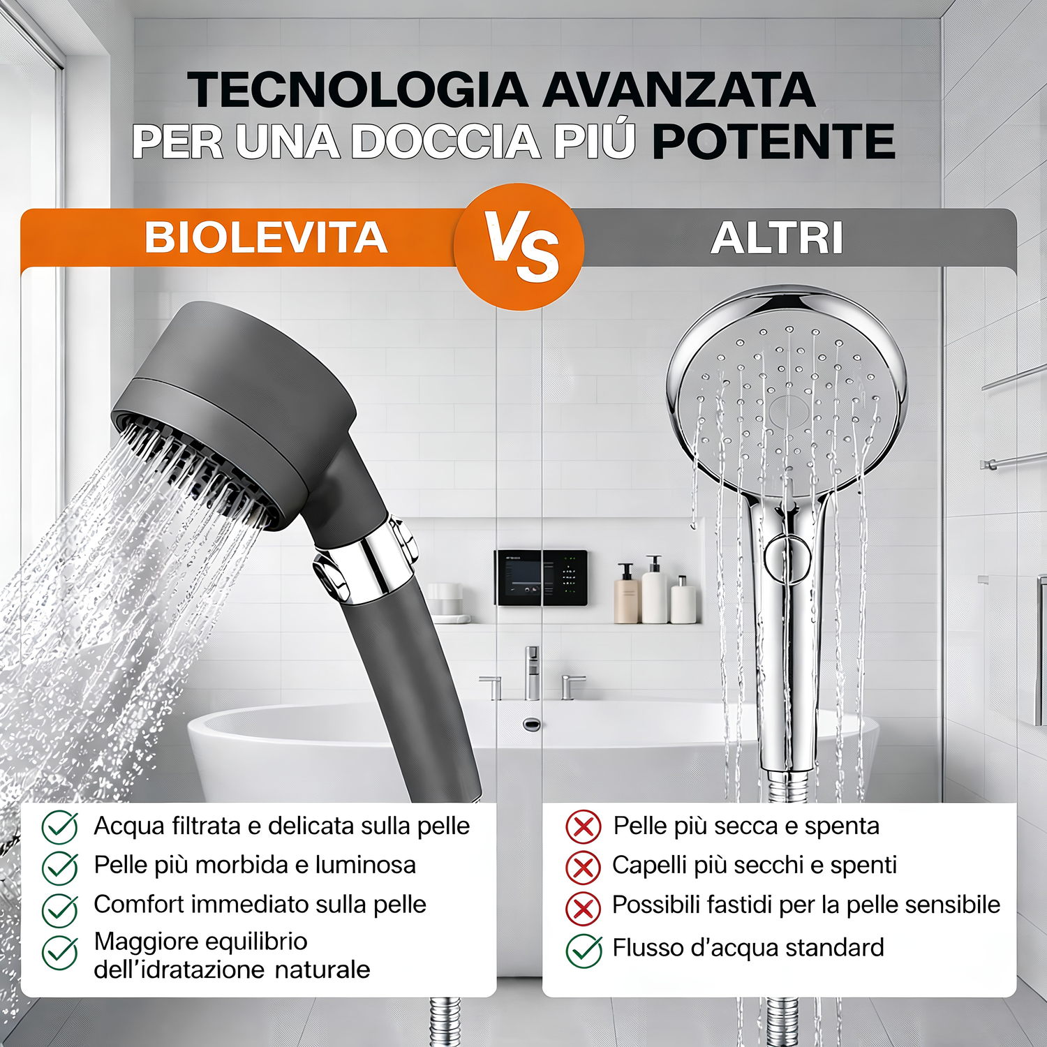 Biolevita migliora la tua doccia con alta pressione, filtro anticalcare e comfort immediato.
