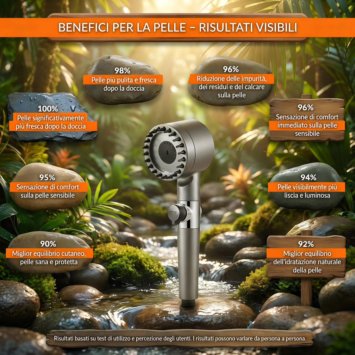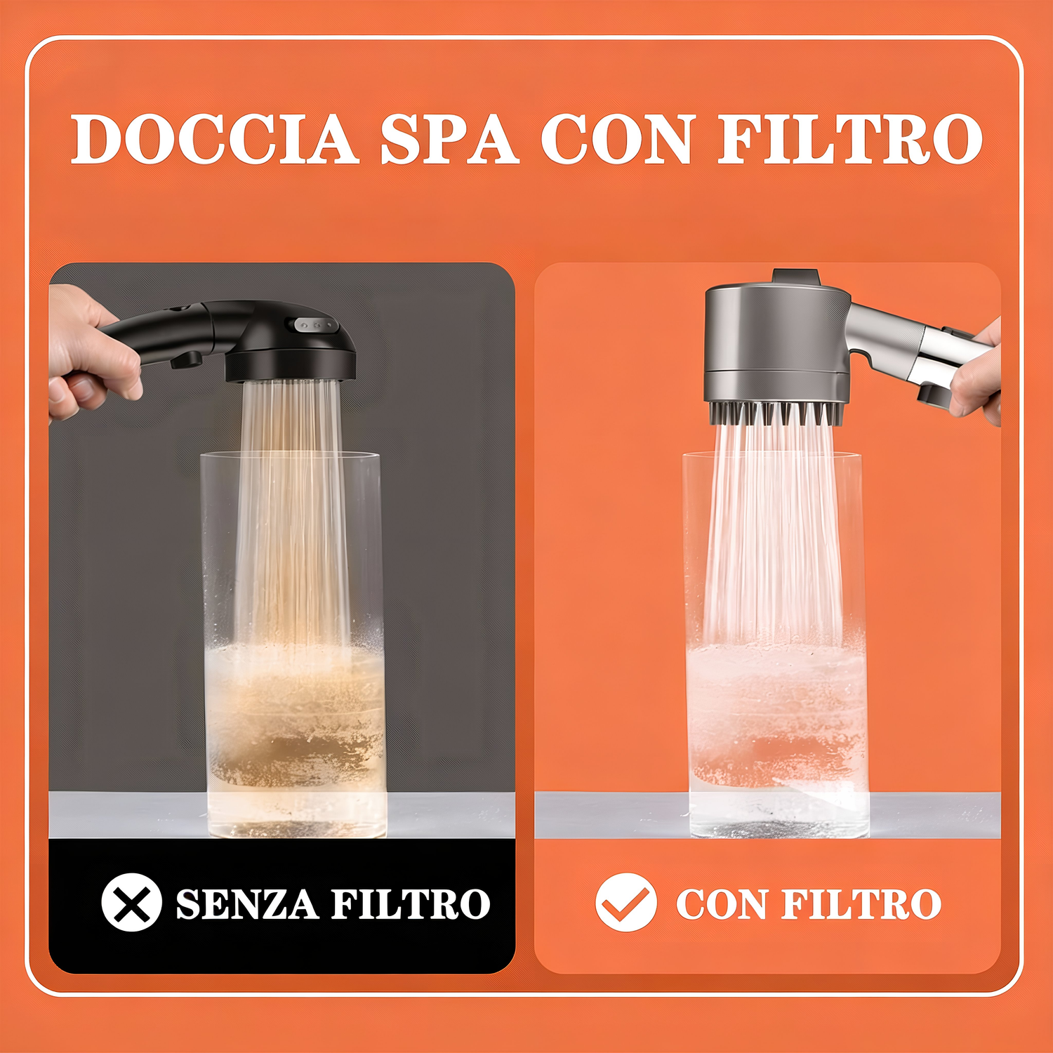 Alta pressione • Filtro anticalcare • Installazione facile • Pelle e capelli più morbidi • Risparmio d’acqua